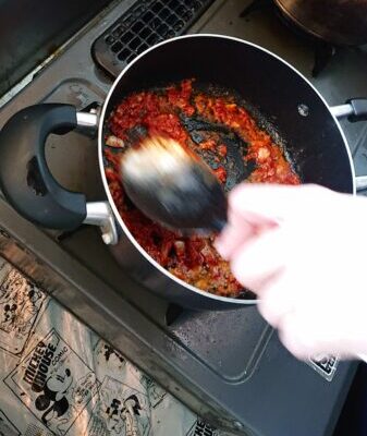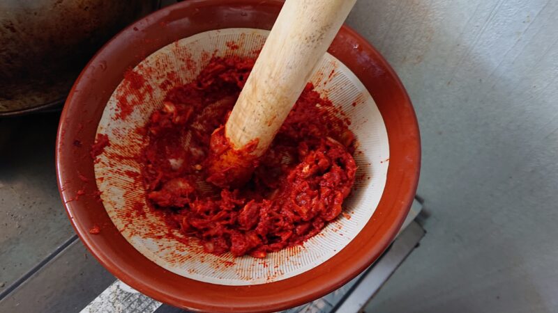 ① ニンニク、たまねぎ、唐辛子をすりつぶします。