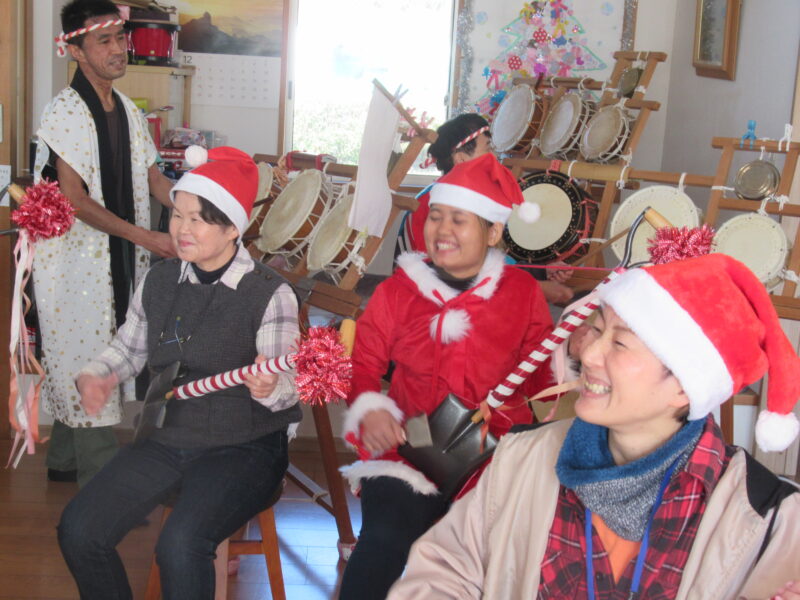 五つ太鼓に合わせて、利用者様も太鼓をたたいたり、鹿児島の代表曲 ”おはら節”に合わせて踊ったり♬