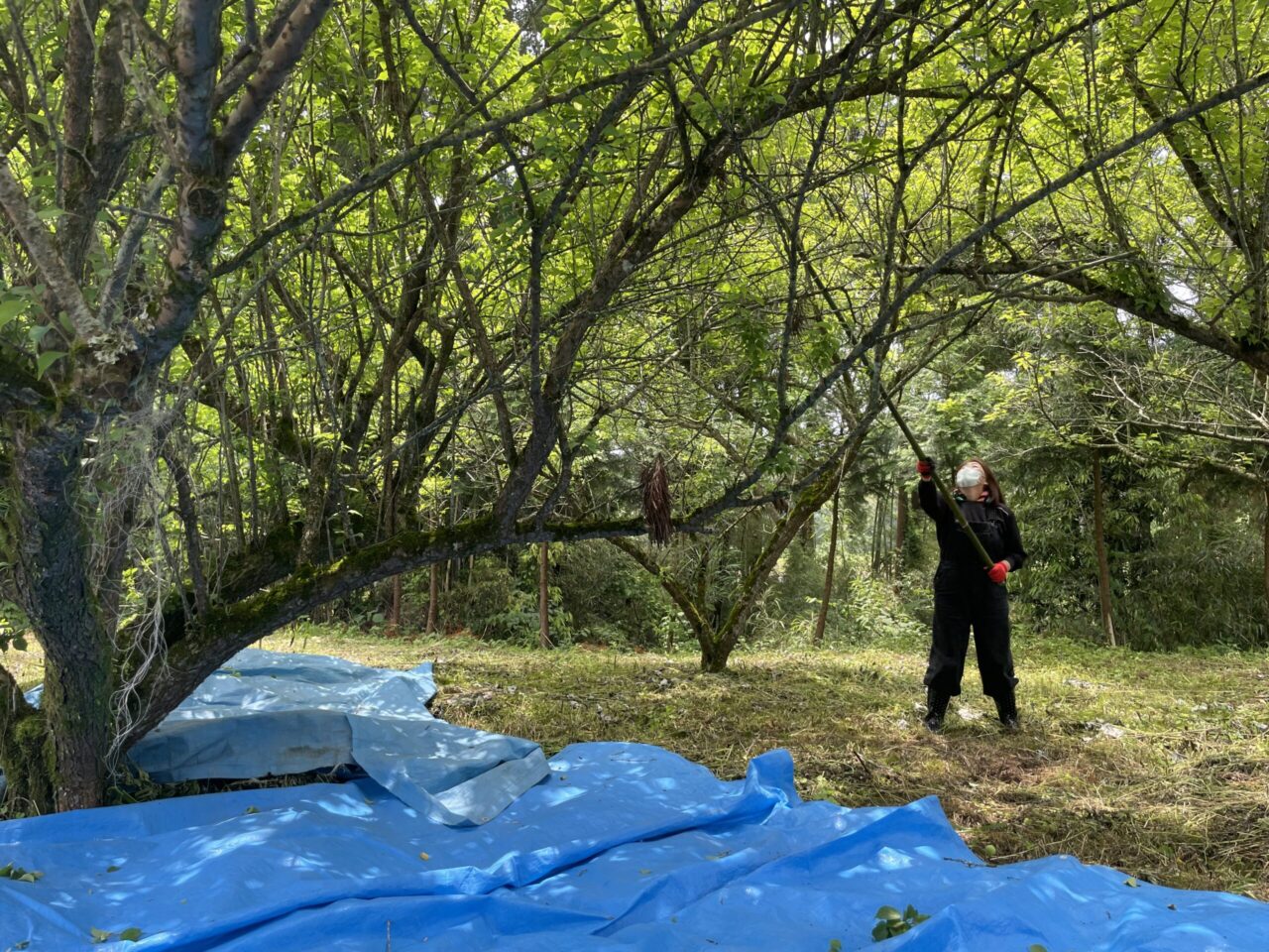 竹を使い、木を揺らし梅を落とし収穫していきます。