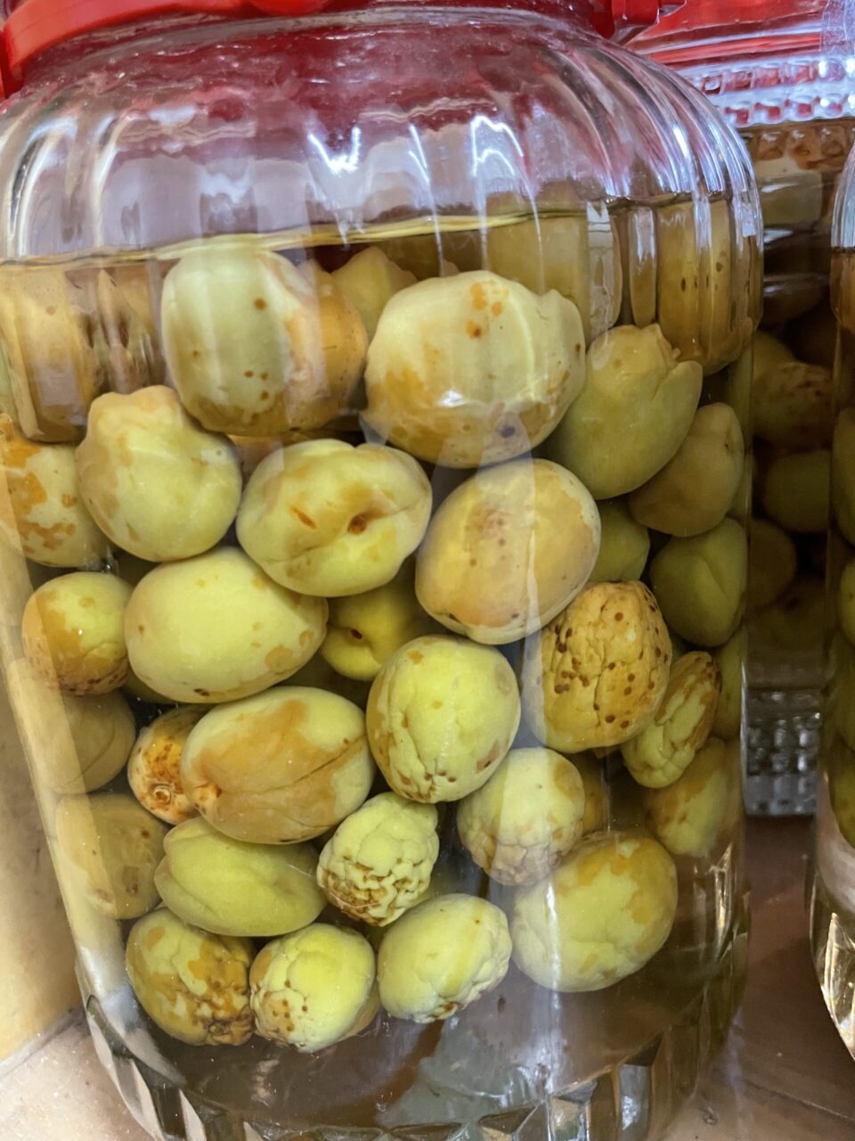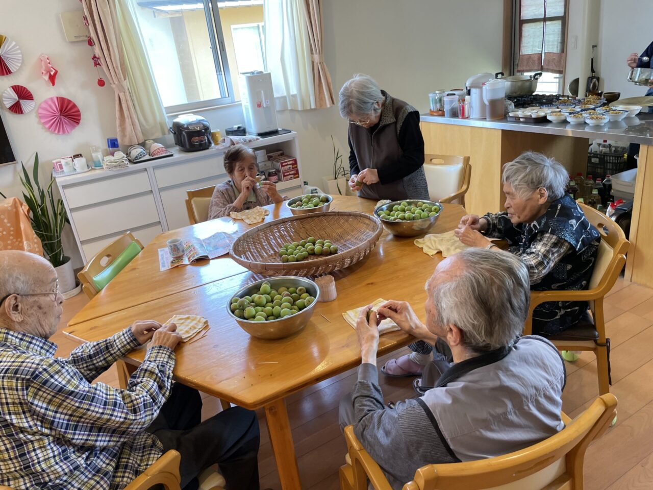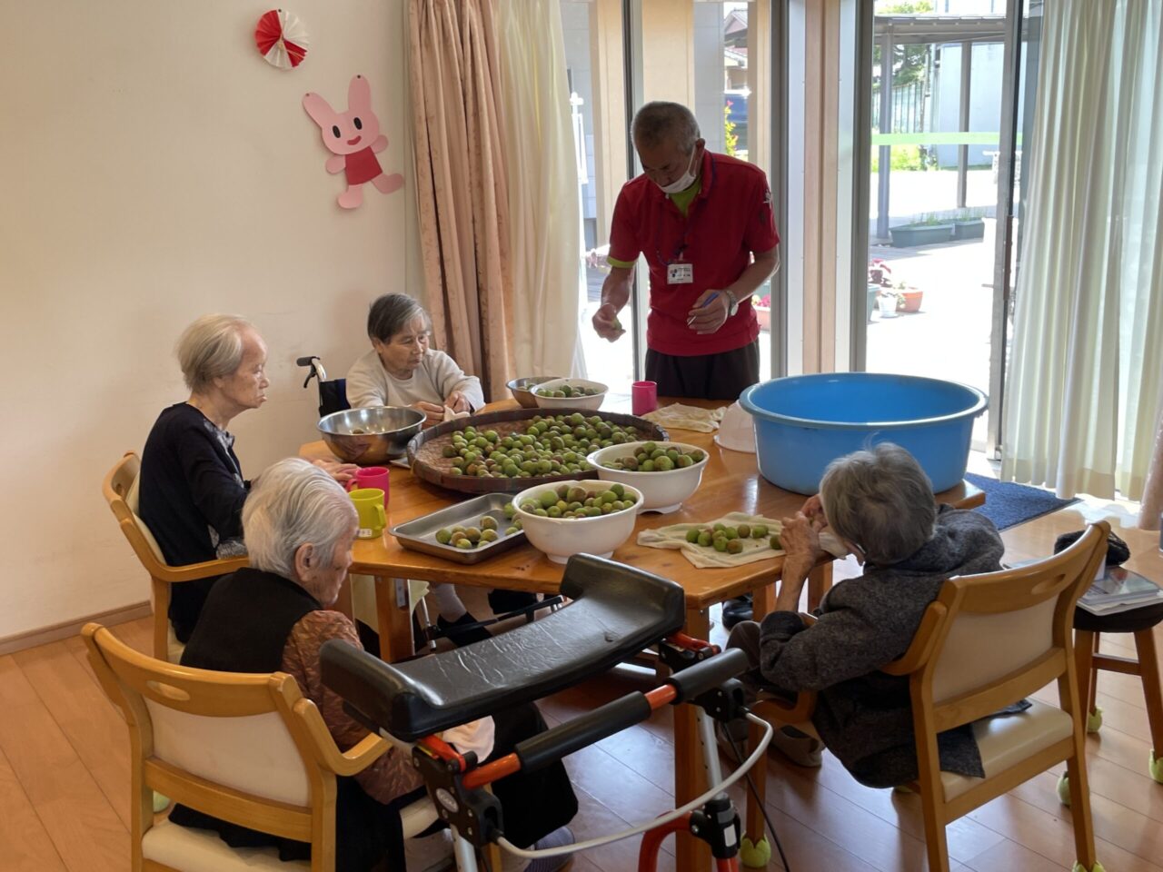 次の日には、皆で酢梅を作る為に下処理、梅を酢に漬けていきます。