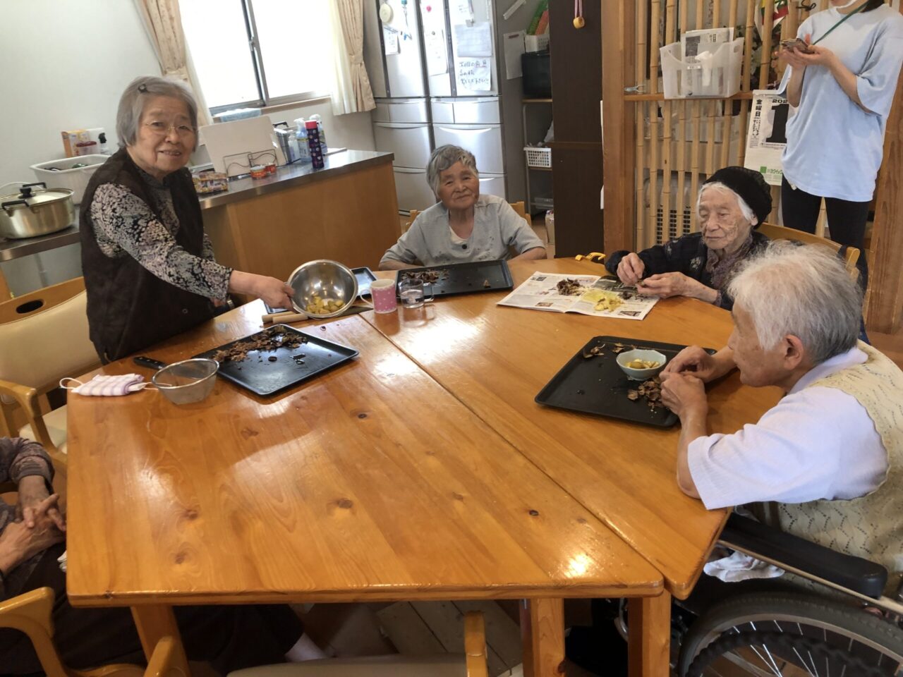 「水に浸けちょったとけ?」と利用者様も職員も硬い皮に苦戦しながら作業が続きます…((+_+))