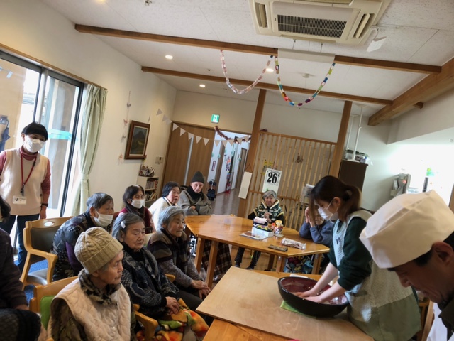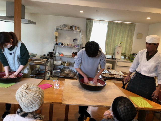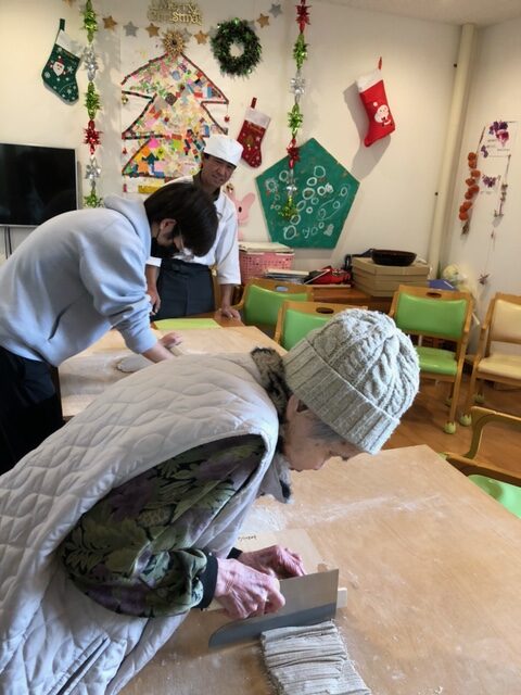 年越しそば打ち 2023.12.28未分類 HOME introduce Tweet Share 今日はそば打ちをしました。 よかよかんでは年末になると、毎年そばを打ちます。 今年も師匠はいちろーさん(*^^*) 今年はそば打ちデビューの職員も!! 皆に見守られながら頑張りました( *´艸`) その日の気温や室内の温度によってそばの出来上がり方が 違うようなので少しずつ少しずつ水も調整していきます。 ご利用者様と一緒に打った手打ちそば、、、 食べるのが楽しみです!! Tweet Share 投稿者: yoka_staffs 未分類 “楽しみながらキャリアアップできる介護施設” をお探しの方にも必見です☆ 高いコミュニケーション力は求めません。 笑顔で挨拶ができて人の話が聴ける。まずはここからです! スタッフ募集を見る クリスマス忘年会✨ 甘くてあったか鏡開き♪ 関連記事一覧 やってくるぞ!! お正月🌄 2023.12.18未分類 みんなでピザパーティ♪ 2023.05.25よかよかんの風, 未分類 子供の日の登校日🖊📔 2024.05.16未分類 たこ焼き祭り~!! 2023.08.27未分類