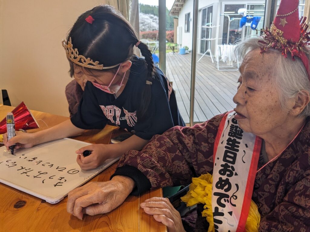T様は耳が聞こえにくいので、小さな援助士さんもお祝いの言葉や、みんなの言葉がT様に伝わるようにと、T様の隣でボードに書きながらのお誕生日会✨