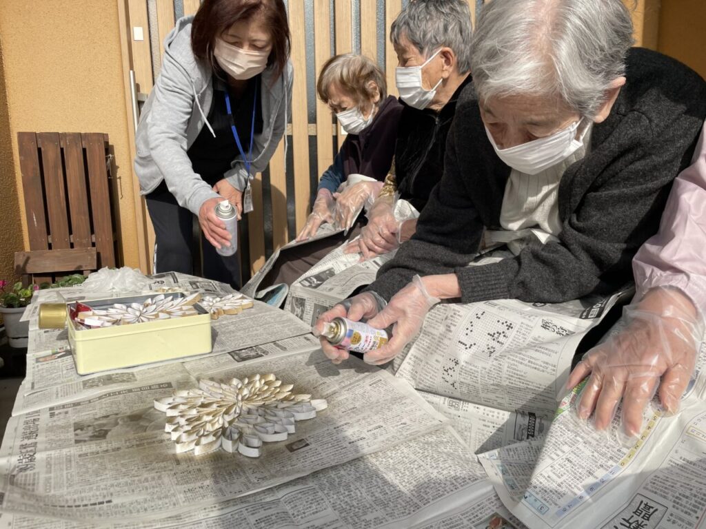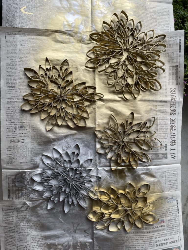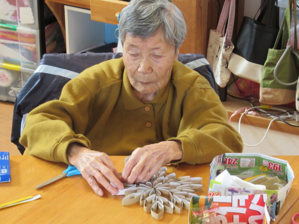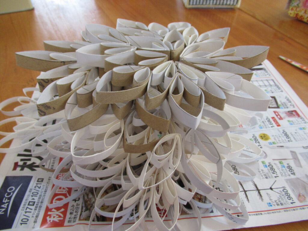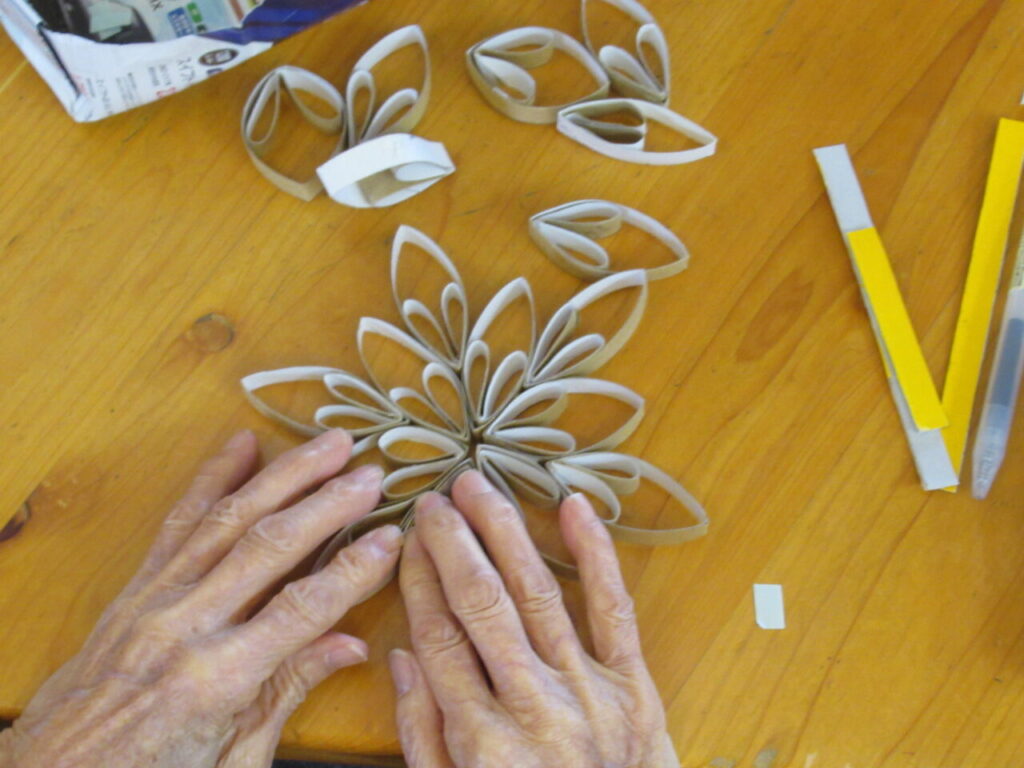 職員が、トイレットペーパーの芯を1㎝幅に切った物を折り曲げて、付けていきます。