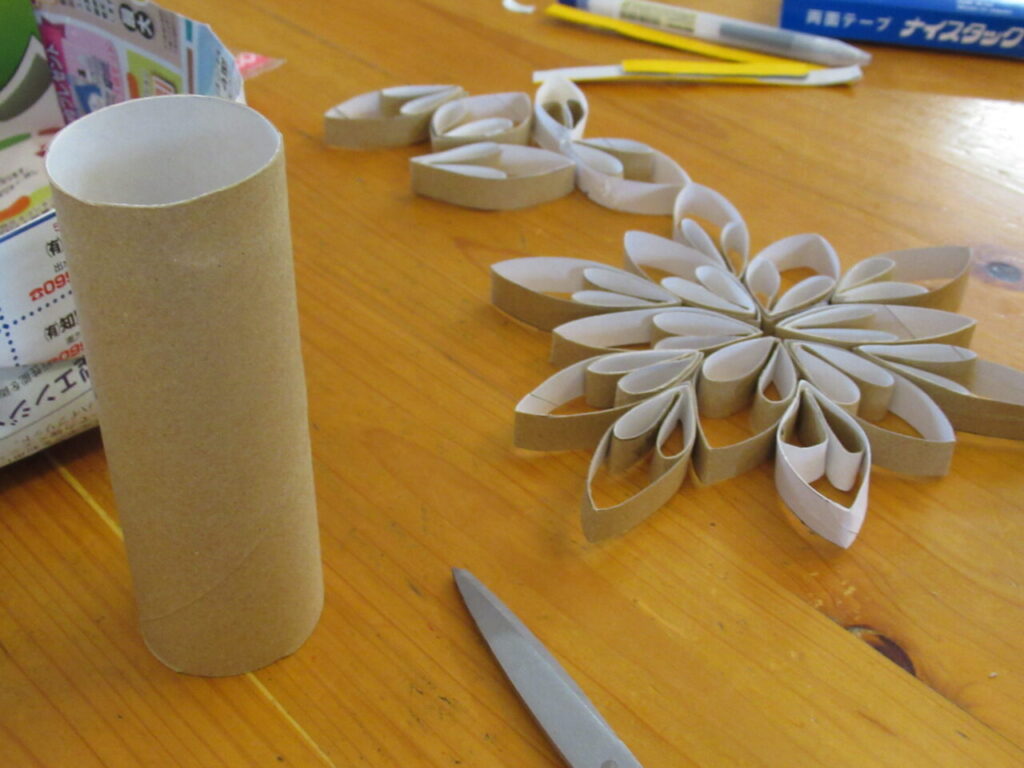 トイレットペーパーの芯を利用して作っていきます。