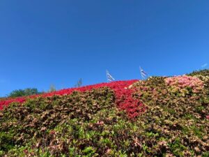 つつじの鮮やかな赤、新緑の美しい緑、晴天の澄んだ青い空。