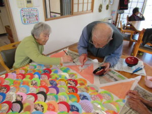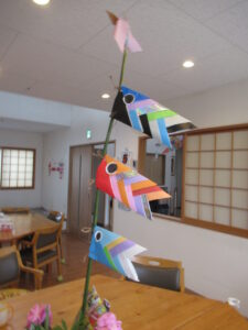 利用者様と鱗を切ったり、のり付けしたり、また、目や尾びれに色付けしたりと、コツコツ頑張るものの